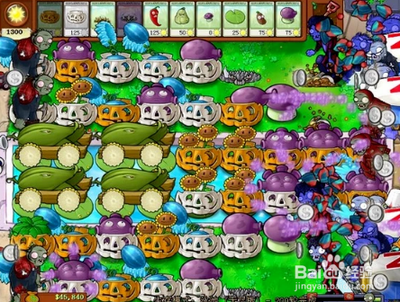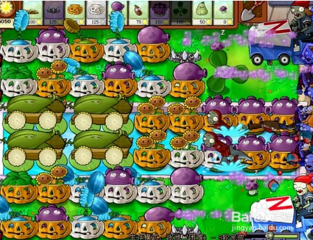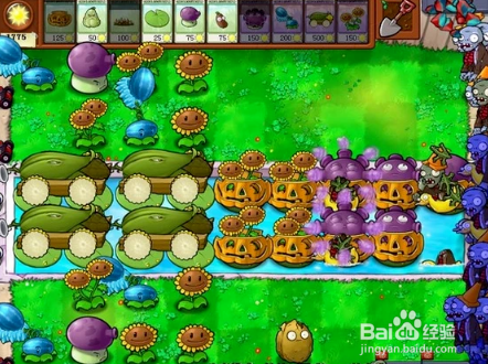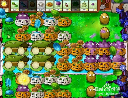 這之后的幾波把雙子向日癸和水路上的憂郁菇補(bǔ)齊,然后前排植物套上南瓜護(hù)盾為后面做好防護(hù)準(zhǔn)備。
