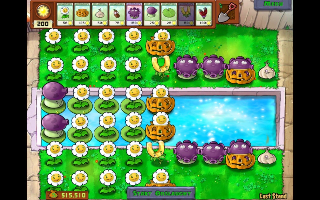 按以上方法,在Last Stand(誰(shuí)笑到最后[年度版翻譯為‘堅(jiān)不可摧’])里擺陣(陽(yáng)光不夠,先憂郁菇、吸金石和右側(cè)的金盞花),一局可以刷大概一萬(wàn)。(需要攜帶植物:大蒜、大噴菇、憂郁菇、南瓜頭、咖啡豆、金盞花、睡蓮、磁力菇、吸金磁)