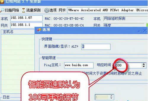 2.第一次運(yùn)行幻境網(wǎng)盾會(huì)彈出一個(gè)“選項(xiàng)”設(shè)置窗口,這里可以設(shè)置界面隱藏快捷鍵、智能限速的設(shè)置、ARP防火墻等。智能限速的默認(rèn)響應(yīng)時(shí)間是100ms,對(duì)于懶人或者小菜鳥(niǎo)來(lái)說(shuō),直接使用默認(rèn)值就可以了。