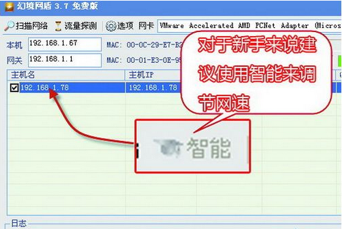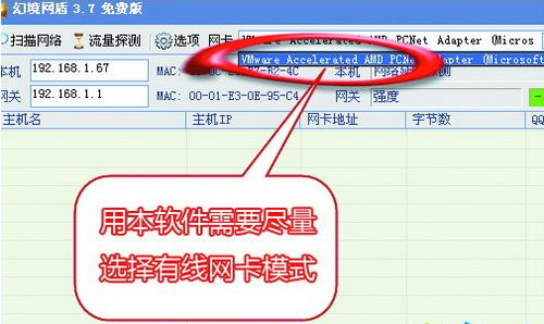 3.在主界面的“網(wǎng)卡”中,選擇接入局域網(wǎng)所用的網(wǎng)卡。如果同時(shí)可以使用無(wú)線連接和有線連接,那么建議在“網(wǎng)卡”中選擇有線網(wǎng)卡,而不要使用無(wú)線網(wǎng)卡,這點(diǎn)請(qǐng)大家記住了。因?yàn)橐暵酚善鞑煌镁尘W(wǎng)盾使用無(wú)線網(wǎng)卡可能根本無(wú)法控制別人的網(wǎng)速。