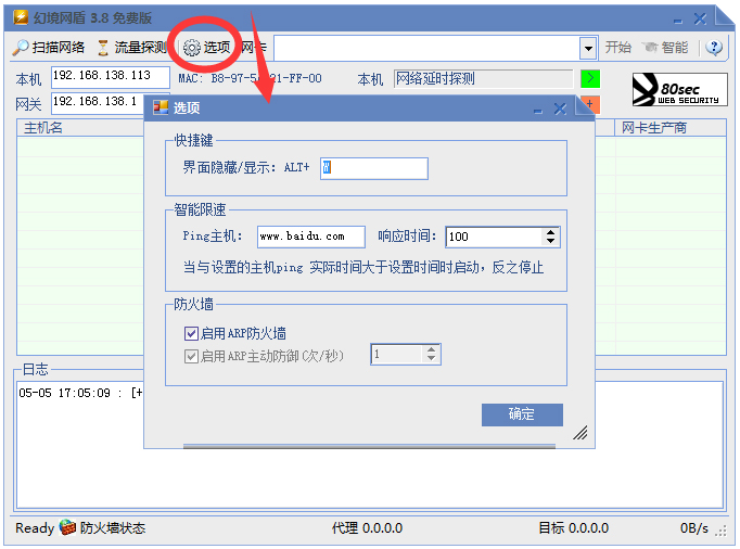 在這項(xiàng)功能中可以設(shè)置軟件隱藏的“快捷鍵”、軟件“智能限速”的主機(jī)和響應(yīng)時(shí)間,還可以啟動(dòng)“ARP防火墻”。