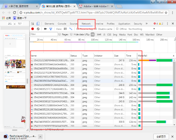 3、接著在開發(fā)者頁面找到“Network”,接著刷新頁面,這時就可以看到審查元素中各元素的加載情況,找到type下面video/mp4等視頻格式,然后單擊點開該文件;