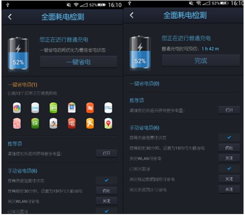 點心省電主頁的狀態(tài)欄不僅可以顯示電池余量,還可以預(yù)估電池可以持續(xù)的時間,當我們還在進行充電時,點心省電(DU Battery Saver)還可以精確到分鐘來提醒用戶還需要多久充電結(jié)束。