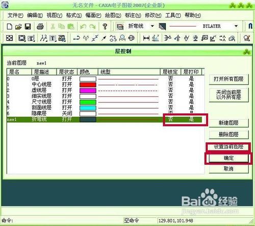 把后面的層鎖定和層打印選上是還是否,如果想隨時(shí)在圖形中刪除圖層的畫建議層鎖定選擇否,打印的時(shí)候如果想把圖層全部打印下來就選擇是。設(shè)定好以后點(diǎn)擊設(shè)置當(dāng)前圖層再點(diǎn)擊確定完成設(shè)定。