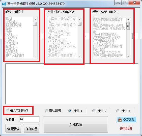 可自定義文章前綴、銜接事件動作、后綴結(jié)果,可實時植入當前熱點,比較適合自媒體標題。