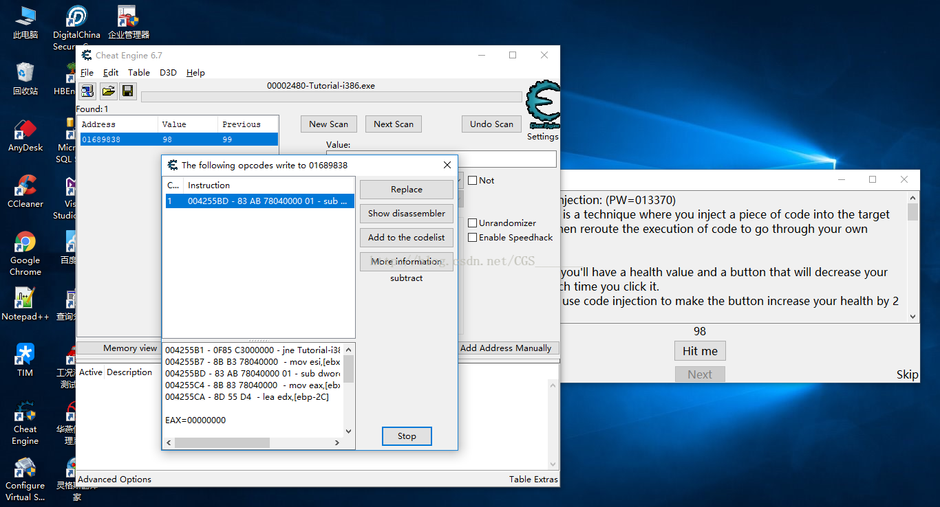 這一關(guān)的目的是讓我們學會如何注入代碼(匯編語言),使用注入代碼來修改程序或游戲中的數(shù)據(jù)。例如本關(guān)中每點擊一次“Hit Me”按鈕,生命值“Health”會較少1,我們知道他的攻擊力為1,本關(guān)的通關(guān)條件是當我們每點擊一次“Hit Me”生命值“Health”增加2,具體操作步驟如下: