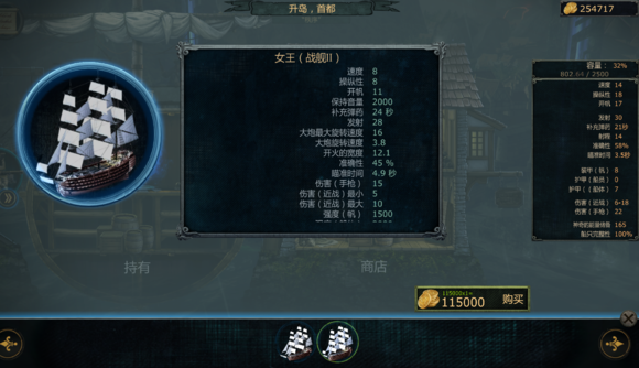 首先你得能看的懂你的船的屬性。速度,航速。影響你在大小地圖上的移動速度。一般來說25左右就夠了。