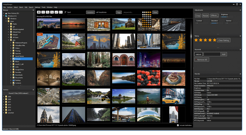 ImageRanger Pro Edition可以在同一屏幕內(nèi)查看文件夾及其子文件夾內(nèi)的所有的圖片,同時(shí)可以按照創(chuàng)建時(shí)間、分辨率、關(guān)鍵字等對(duì)所有圖片進(jìn)行分類篩選,方便用戶查找。內(nèi)置了圖片編輯功能,用戶可以調(diào)整圖片的亮度、對(duì)比度、裁剪、旋轉(zhuǎn)等設(shè)置,支持批量操作;軟件可自動(dòng)識(shí)別低對(duì)比度的圖片并提升其對(duì)比度,不過這一功能最好關(guān)掉,若是自動(dòng)調(diào)整了本不需要調(diào)整的圖片就不好了。用戶可以對(duì)單個(gè)和多個(gè)圖像進(jìn)行星級(jí)評(píng)級(jí),分配和刪除關(guān)鍵字標(biāo)簽以及查看照片的EXIF元信息等。
