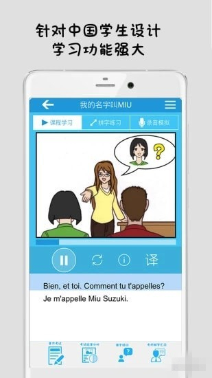 *與法語母語者發(fā)音進行對比,無限次數(shù),直到發(fā)音滿意為止,幫助你快速掌握純正的發(fā)音,解決開口難的難題。支持錄音存儲功能,隨時回聽