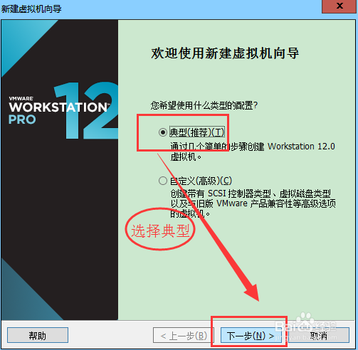 點(diǎn)擊創(chuàng)建新的虛擬機(jī),然后在彈出的界面中選擇典型,點(diǎn)擊下一步