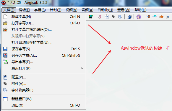 在文件選項(xiàng)那里,我們一般不用新建字幕,直接在下面弄好保存就行了,視屏導(dǎo)入的話也沒什么好解釋的,音頻也是,好多的快捷鍵在偏設(shè)置那里都有,安裝好后的aegisub直接使用默認(rèn)設(shè)置就行了