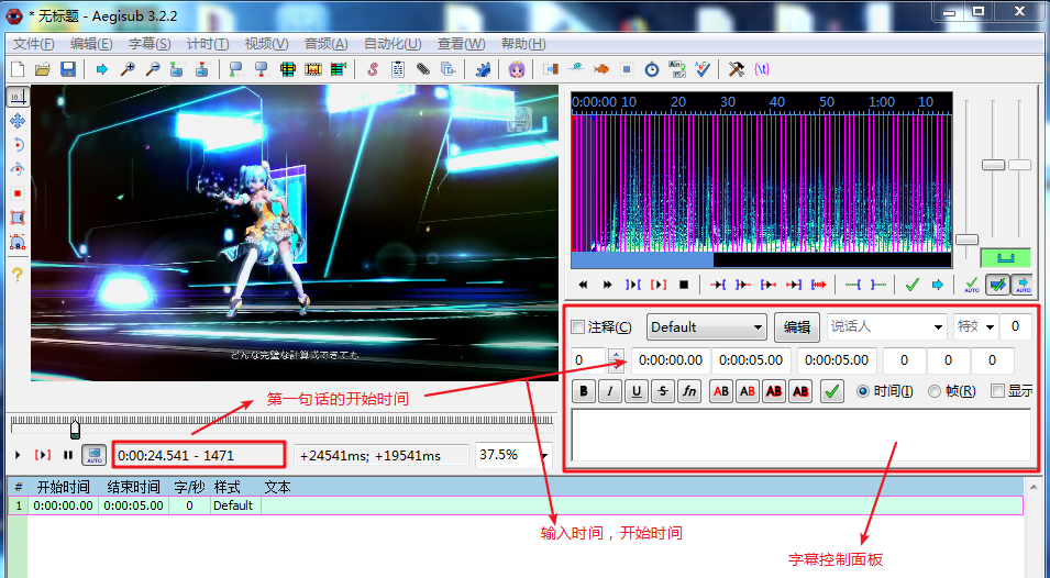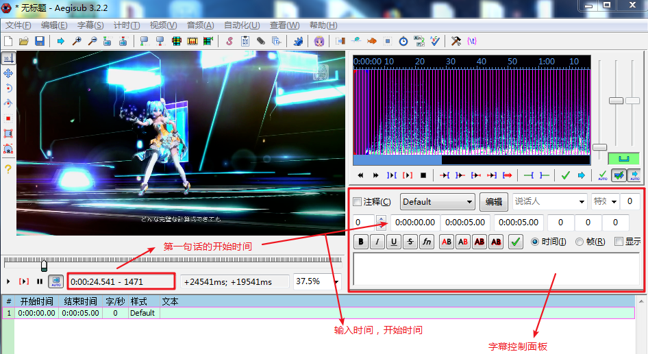 aegisub支持的精度為1ms,普通的視屏播放器支持進(jìn)度為10ms,找到右邊的字幕時(shí)間控制面板,輸入剛剛記錄的時(shí)間,24.54,然后再用同樣的方式,進(jìn)行播放,直到初音唱完這句話,然后暫停,記錄結(jié)束時(shí)間,然后輸入,下面的空白的地方輸入字幕的,時(shí)間確定好后,點(diǎn)擊旁邊的那個(gè)綠色的小勾,字幕就出現(xiàn)在視屏上了
