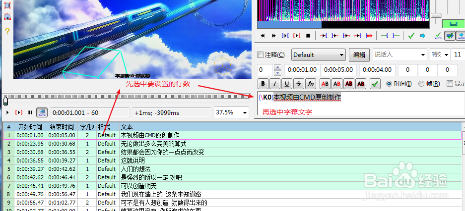 設(shè)置字幕的樣式,按照上面的方法,弄好字幕后,設(shè)置一下樣式,aegisub的快捷鍵和window或者word的一樣,先在字幕面板選擇,要設(shè)置樣式的字幕行,在時(shí)間控制面板,隨意選中字幕文字,必須要選,不然會(huì)出問題