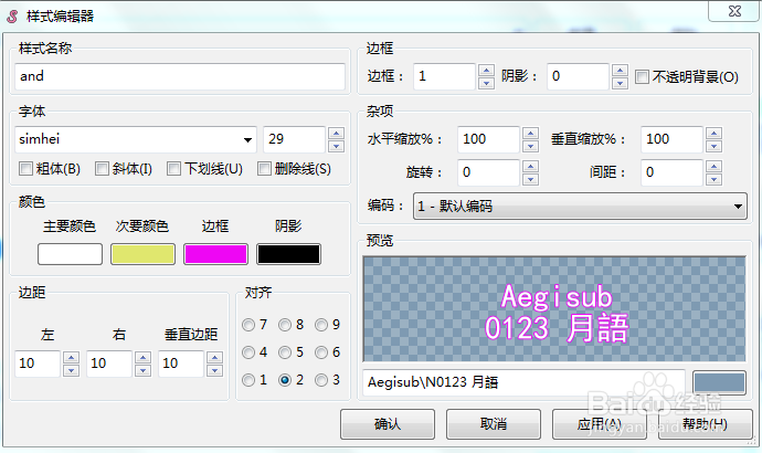 點(diǎn)擊新建,彈出樣式設(shè)置窗口,大家可以自行設(shè)置,樣式的名稱,顏色這些,邊框和陰影默認(rèn)是2,通常建議邊框設(shè)置為1,陰影為0,除非特效需要,對(duì)齊的話2是底端居中對(duì)齊,其它的大家可以編輯好后,直接應(yīng)用一下,就可以在視屏上查看效果,邊距的話不需要解釋,和word的一樣,設(shè)置好后點(diǎn)擊確定。