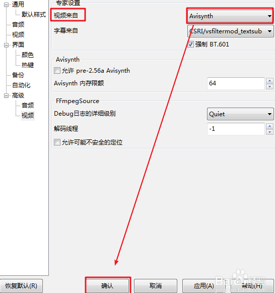 打開偏好設(shè)置,找到高級(jí),視屏來自,默認(rèn)是選擇FFmpegSource來解碼的,相當(dāng)于軟解,我們選擇第二個(gè)Avisynth,這時(shí)候會(huì)彈出一個(gè)英文提示,點(diǎn)擊確定,這樣播放視屏就不會(huì)卡,但也有一些其它的問題