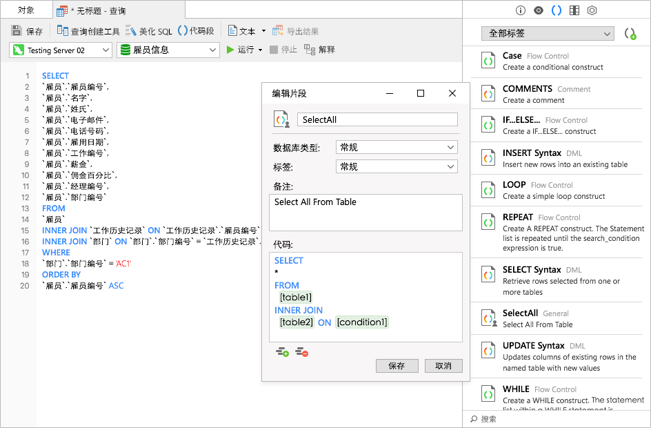 在 SQL 編輯器中插入一組代碼段,以便更快速無誤地編寫 SQL。