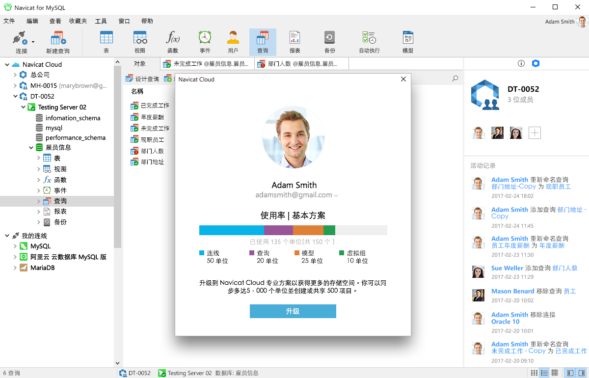 將你的連接設置、模型、查詢和虛擬組同步到我們的 Navicat Cloud 服務,以便你可實時訪問它們,并隨時隨地與同事分享。有了 Navicat Cloud,你可善用每分每秒,使你的生產力達致最高。 了解更多 >