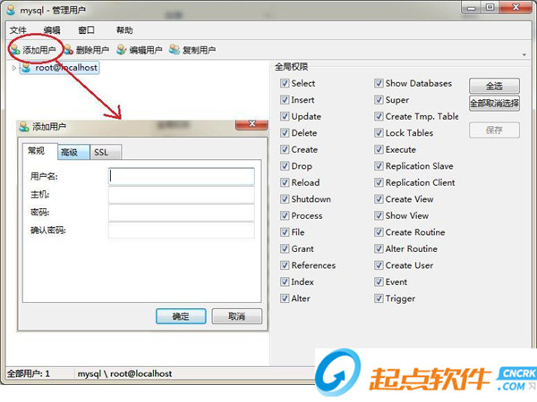 選擇【添加用戶】選項,在提示窗口中輸入用戶名及相關信息后添加,新添加的用戶是沒有任何操作權限的。我們可以根據業(yè)務要求對其適當的授權,比如只能執(zhí)行查看(select)命令。