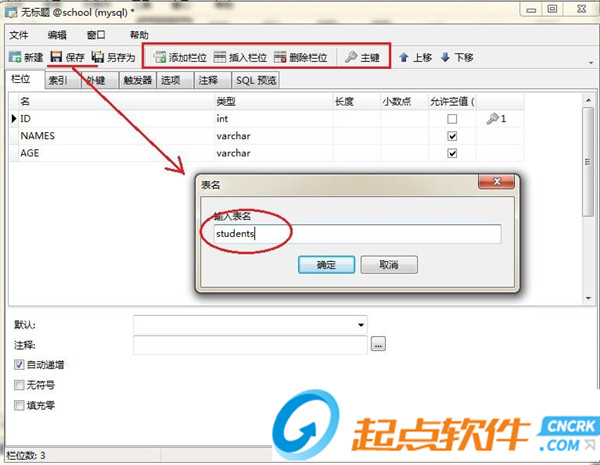 在建表過程中有一個地方要特別的注意,就是“欄位”,對于初次使用Navicat的新手來說,這個比較陌生,它的意思就是我們通常所說的“字段”,工具欄中的“添加欄位”即添加字段的意思,不要弄混了就成,添加完所有的字段以后要根據需求設置相應的“主鍵”。