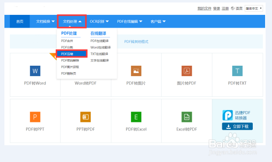 進(jìn)入到轉(zhuǎn)換工具界面,然后在上方的導(dǎo)航條中,點(diǎn)擊“文檔處理”,再選擇“PDF壓縮”。