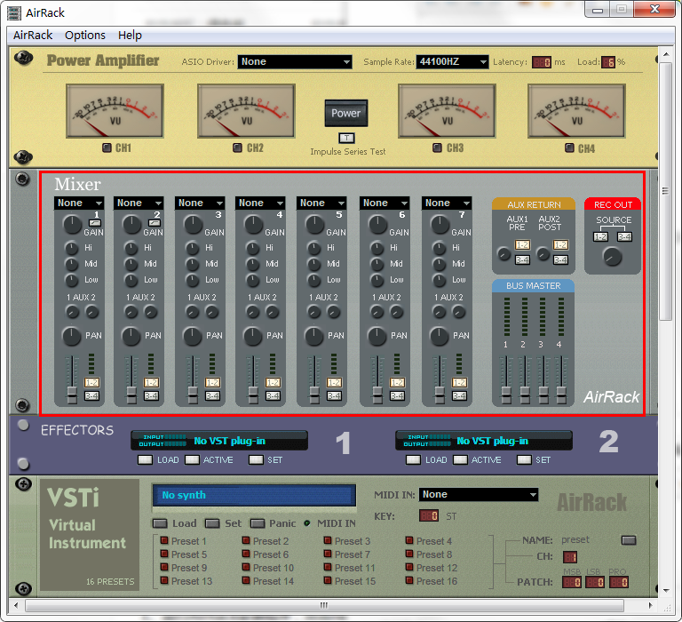 1、AirRack官方版提供功能強(qiáng)大的 4 總線,3段EQ,帶壓限的調(diào)音臺用來連接各個模塊和聲卡;2、雙 VST 效果器用 VST 插件來給輸入通道加效果;
