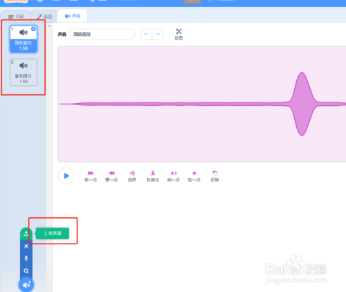 別忘了還有游戲中用到的音效哦。這里用到了兩種得分音效。一種普通得分音效,一種高分音效。可從素材庫選擇,也可以自己從網(wǎng)上下載制作自己喜歡的音效上傳哦!