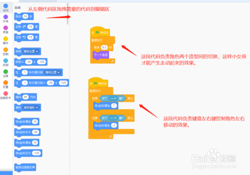參考例圖,把相應積木塊拖動到代碼區(qū),并組合