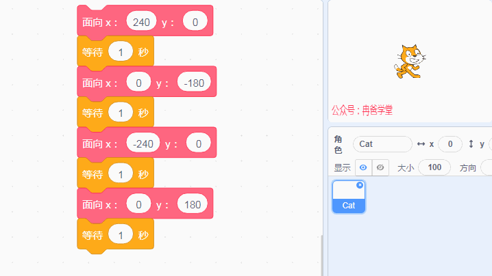 現(xiàn)在來使用新建的積木塊,讓角色面朝指定的坐標吧: