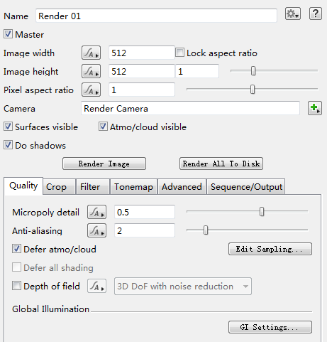 Terragen 4的標簽分別為Objects對象,Terrain地形,Shaders著色器,Water水,Atmosphere大氣,Lighting光照,Cameras相機,Renderers渲染器。相機和渲染器前面已經(jīng)簡單提及過,接下來我們主要講如何向豐富我們的場景。這里只作為一個Quick Start,不會做太深入的講解,如果有深度需求的需要去官方的文檔自己研究了。
