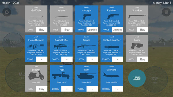 1、讓我們通過殺死動物和怪物來收錢。2、你可以購買各種武器和車輛,坦克和飛機也可以購買。