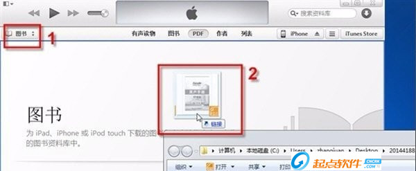 4、點擊“圖書”按鈕,在工具欄上的“文件”中點擊“將文件添加到資料庫”將pc上事先下載好的圖書添加進去或者直接將保存圖書的文件夾打開,將下載的圖書通過鼠標直接拖曳到iTunes中;