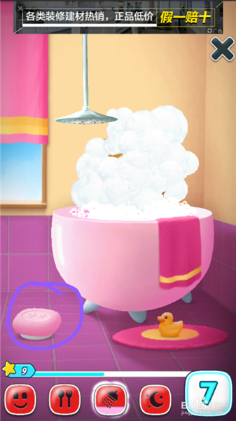 3、點(diǎn)擊肥皂,在貓咪身上不停地抹,抹到掉金幣。然后用水龍頭把它沖干凈。