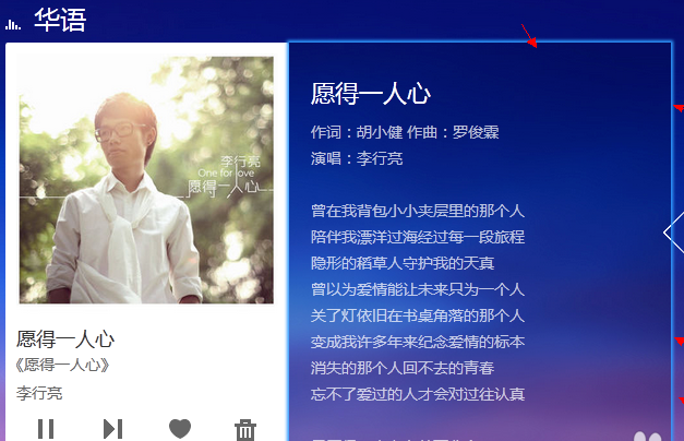 3、紅心:標記為我喜歡,聽到喜歡的歌曲, 點紅心, 系統(tǒng)可通過此收集用戶偏好,遇到喜歡的歌曲, 請點擊“我喜歡”按鈕 , 告訴百度您的音樂喜好; 再次點擊可以取消當前標記。