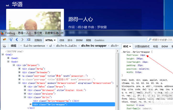 鼠標左擊后,firebug自動彈出當前網(wǎng)頁的源代碼。我們可以看到當隨心聽設置字體大小為14px。