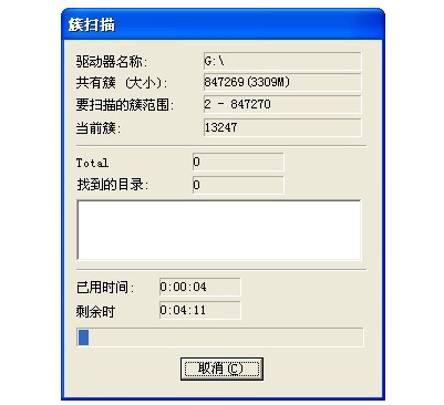 3、點(diǎn)擊確定,這樣程序就會(huì)開始進(jìn)入到簇掃描尋找我們誤刪除或者丟失的文件:
