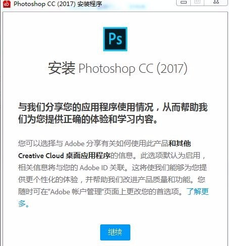 安裝從本站下載完成后打開Adobe CC 2017\AdobePhotoshop18-mul_x64下的Set-up,輸入Adobe ID和密碼,注冊一個即可。然后點擊繼續(xù)等待安裝完成。