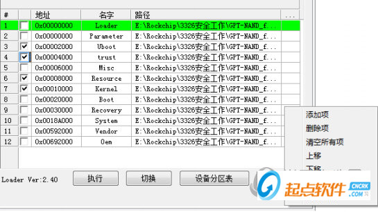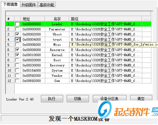 設(shè)備進入Loader或者Maskrom狀態(tài)連接PC,maskrom狀態(tài)下要勾選”Loader”下載項勾選燒錄項,確認(rèn)燒錄項前面的地址正確,如果地址為零,可以通過選擇”Parameter”分區(qū)表進行分區(qū)信息加載,最后點擊”執(zhí)行”