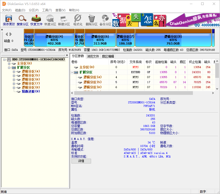 DiskGenius完成硬盤分區(qū)掃描后的主界面如下圖所示: