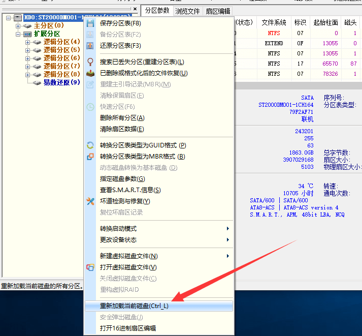 如果用戶對搜索結果不滿意,不想保存這些分區(qū),可以點擊右鍵菜單,選擇“重新加載當前磁盤”,放棄DiskGenius當前的分區(qū)掃描結果,如下圖所示: