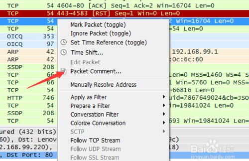 3、這樣就會彈出了下拉菜單中,進(jìn)行選擇為菜單中的“packet comment”