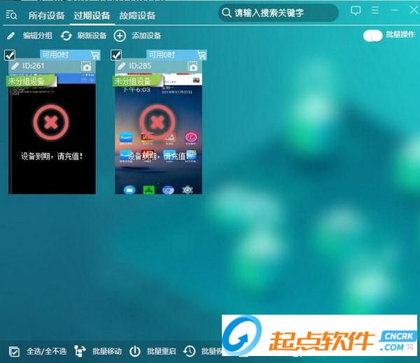 4、工具欄右側“批量操作”功能:打開此功能單個設備左角會出現(xiàn)復選框,單個設備界面上的工具欄會消失,界面底部會出現(xiàn)批量操作工具欄,可多選設備進行批量操作。