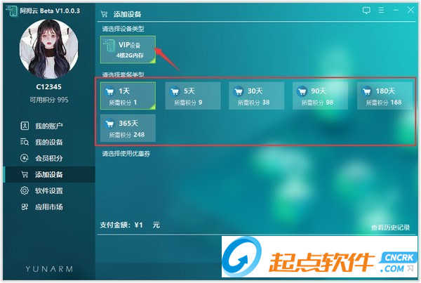 3、點擊“添加設備”,進入如下界面,選擇設備類型和套餐類型,選擇底部支付方式完成支付即可成功添加新設備。