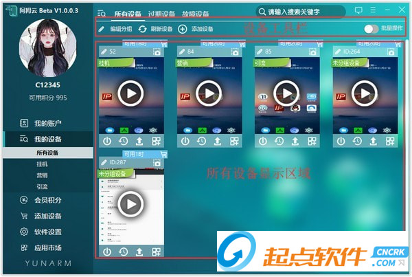 “我的設備”界面是管理所有云手機設備及操作云手機設備的主界面,在此界面可進行設備的管理和操作。