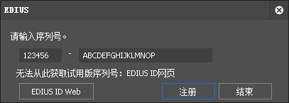 如果軟件沒有被激活,在運行EDIUS時會彈出下面窗口。在下圖所示的空白處輸入序列號并點擊[注冊]按鈕。(下圖所輸入的注冊序列號僅是示意,并非真實軟件注冊號)