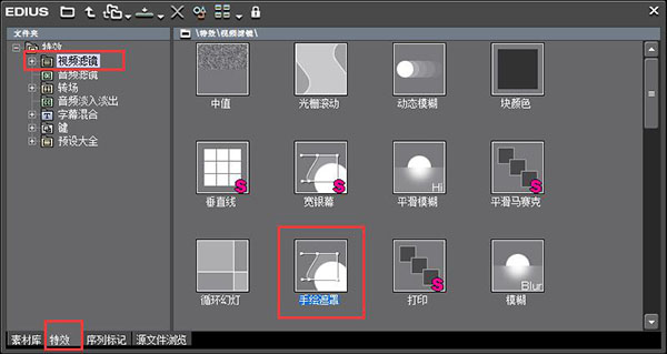 2、點擊【特效】——【視頻濾鏡】——【手繪遮罩】,將手繪遮罩濾鏡拖動到3v軌道的素材上;