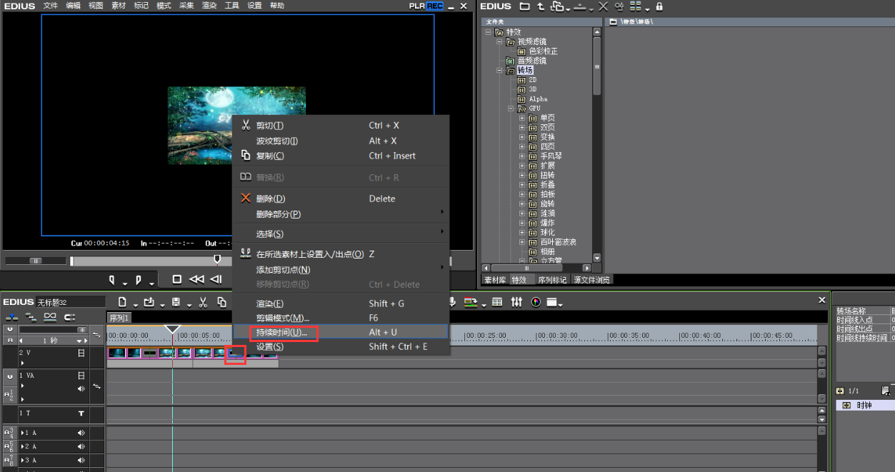 2、解決了上述1的問題后,我們會迎來另一個問題,那就是這些時間都被我們統(tǒng)一設置了,如果我們想要讓某個轉場的時間不一樣那又該怎么辦呢?其實這個很簡單,我們只需找到要設置不同特效的那個轉場,右擊它,然后選擇“持續(xù)時間”,把它改成你們想要的時間即可。具體操作見下圖: