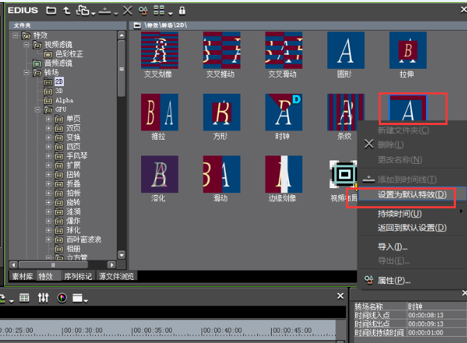 3、我們利用時間線面板上面的“設置默認轉場”按鈕可以給素材之間快速的添加轉場。根據字樣我們就可以知道我們添加的轉場是EDIUS默認的轉場。那如果我們不喜歡這個默認轉場,可以換成別的轉場么?答案當然是肯定的。首先我們打開特效面板,找到“轉場”,我們點擊“2D”在它右面的窗口中就會出現(xiàn)好多特效。我們仔細看一下這些特效,會發(fā)現(xiàn)其中有一個特效的右上角帶有“D”,這個也就是我們的那個默認轉場。我們找到我們想要替換成默認轉場的特效,右擊,選擇“設置成默認轉場”。這樣我們就完成了,我們可以發(fā)現(xiàn),原先右上角帶有“D”的特效,現(xiàn)在已經沒有“D”了,而新設置的那個特效右上角有了“D”。詳細操作見下圖“