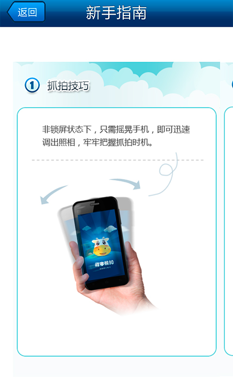 快速調(diào)用照相機(jī):無需找拍照圖標(biāo),只需搖一搖手機(jī),0.5秒即可調(diào)出拍照界面,牢牢把握抓拍時機(jī),捕捉精彩瞬間;