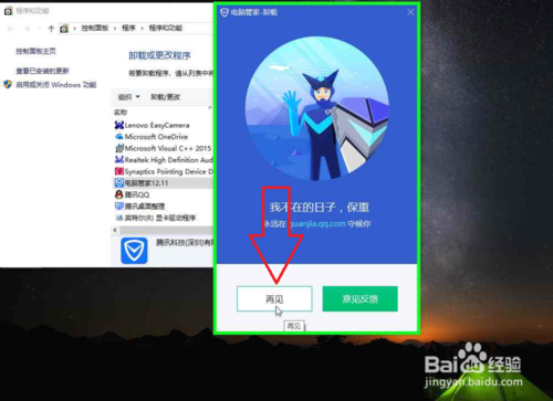 12、在"電腦管家 卸載 (窗格)"上左鍵單擊:"再見(jiàn)(按鈕)",(在"電腦管家 卸載 "中)。