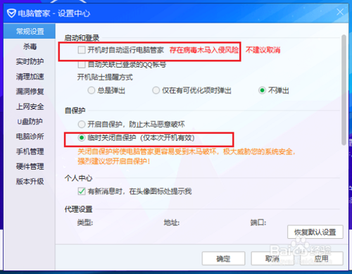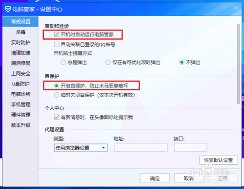 4、將開(kāi)機(jī)時(shí)自動(dòng)運(yùn)行電腦管家”項(xiàng)取消勾選,自保護(hù)也可以關(guān)閉掉,點(diǎn)擊確定就設(shè)置完成了,如下圖所示: